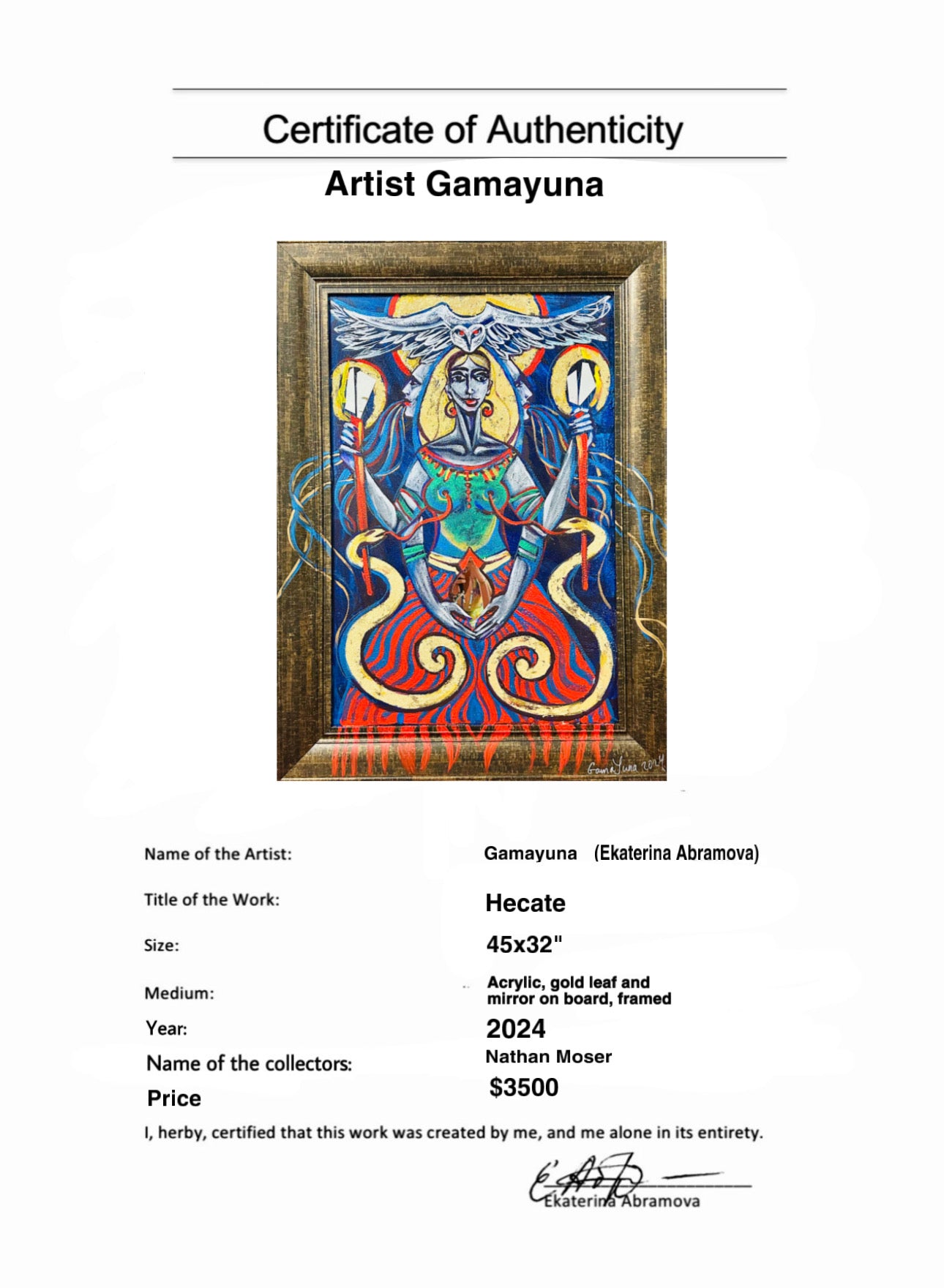 I painted Hecate, the goddess of crossroads – a powerful guide in moments when we stand at the edge of important decisions. Hecate appears in the darkest times to illuminate our path and help us find the right direction. This artwork embodies that mystical force, reminding us that even in shadow, we are never alone.